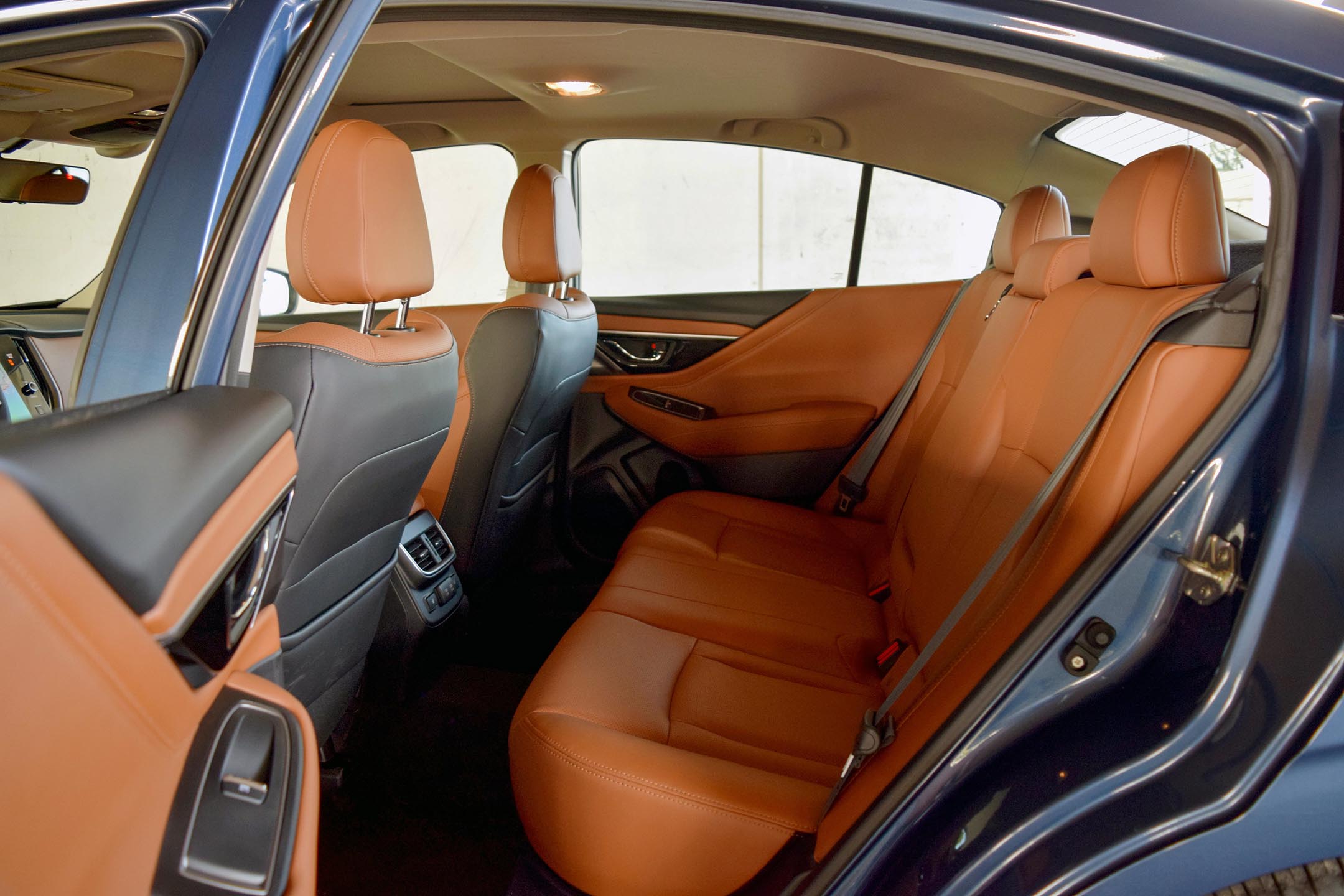 While the Legacy struggles to make an impression with its exterior design, the vehicle manages to shine with its interior, especially in the top trim with its tan leather upholstery. While the large touchscreen infotainment system dominates the dashboard, the finish of the switchgear and materials is nice. Subaru manages to hide the less-desirable and lower-quality bits well, and there are limited squeaks and rattles in the cabin. [The opposite was true of the one tested against the Honda Accord earlier this year. – Ed.] However, the clean design means that many controls are hidden within the large touchscreen, and actually using it is a different story.