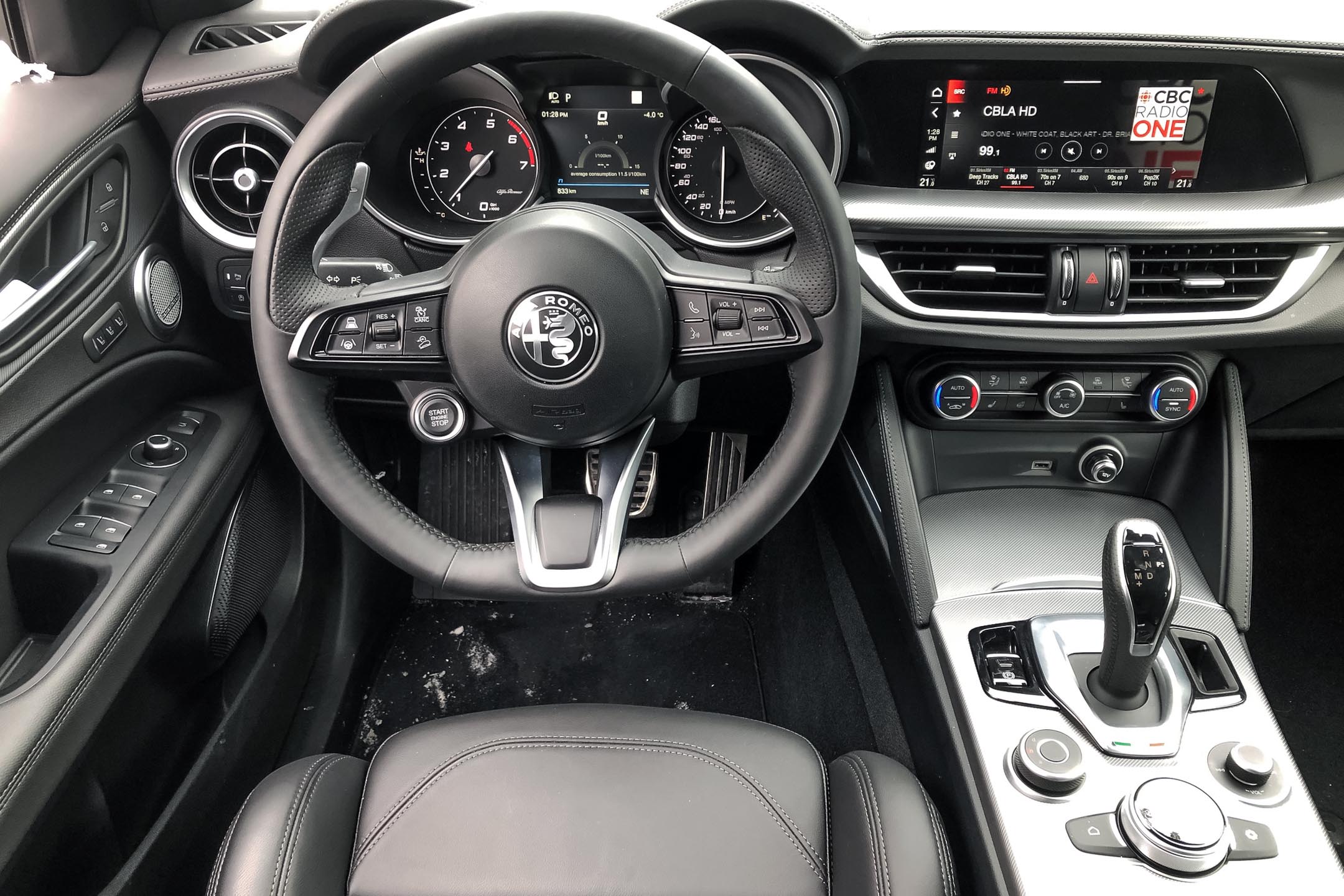 Natural Resources Canada (NRCan) pegs the four-cylinder 2022 Alfa Romeo Stelvio at 10.8 L/100 km city, 8.3 highway, and 9.6 combined, which compares favourably to the four-pot Porsche Macan at 12.4/9.3/11.0, and the BMW X3 xDrive30i at 11.0/8.5/9.9. This cold winter week of testing netted 11.4 L/100 km. Premium-grade fuel is required.
