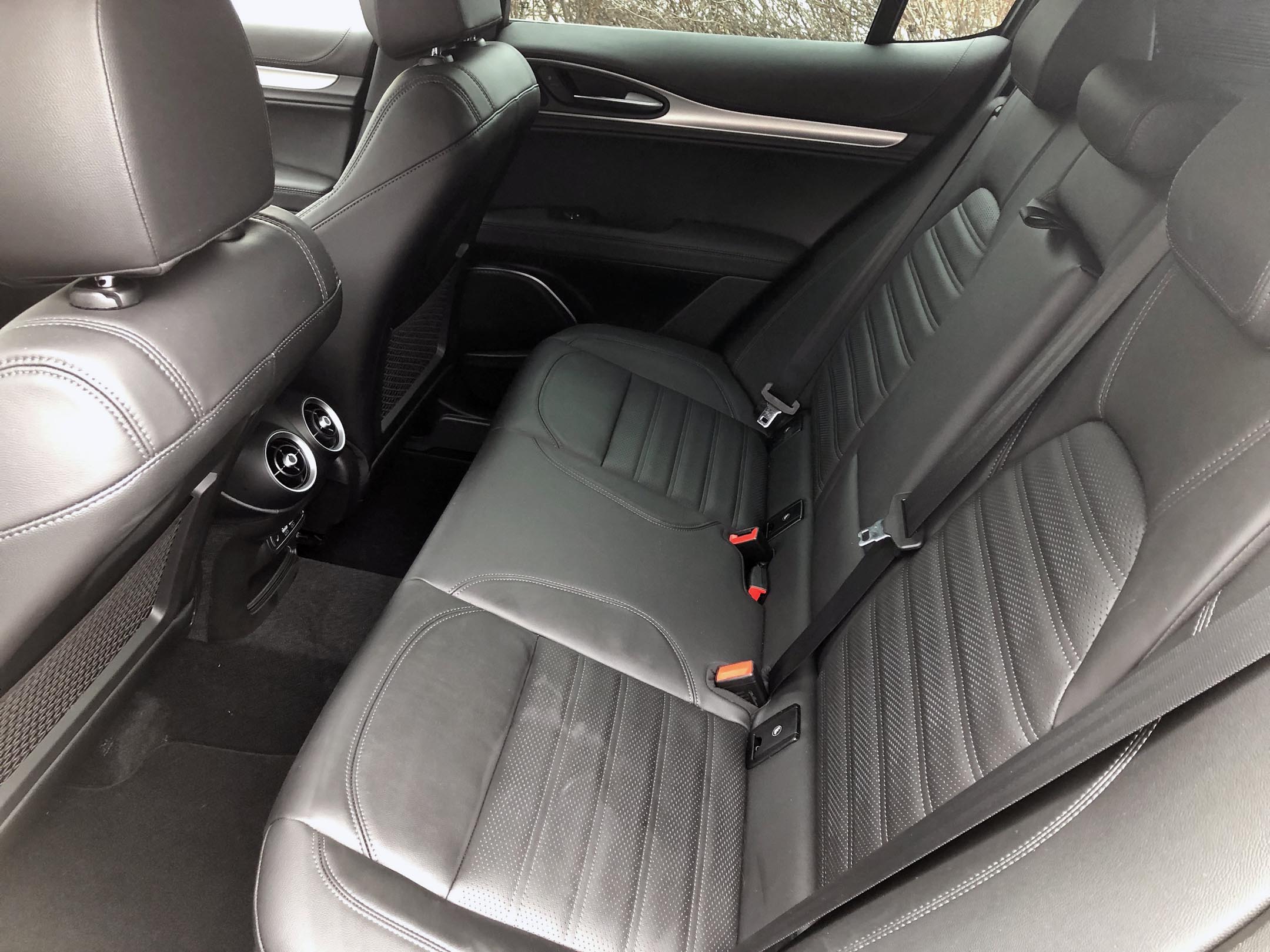 The front leather sports seats in the Veloce are superb, delivering a terrific blend of sporting support and long-distance comfort. Ventilation is not on the menu. The second-row outboard seats (also heated) are nicely contoured as well, but the Stelvio’s tidy dimensions translate to less legroom than seen in many rivals. However, with the front seat set for my six-foot frame, I could pull off the proverbial “sit behind myself” without my knees rubbing against the back of the front seat (although just barely).