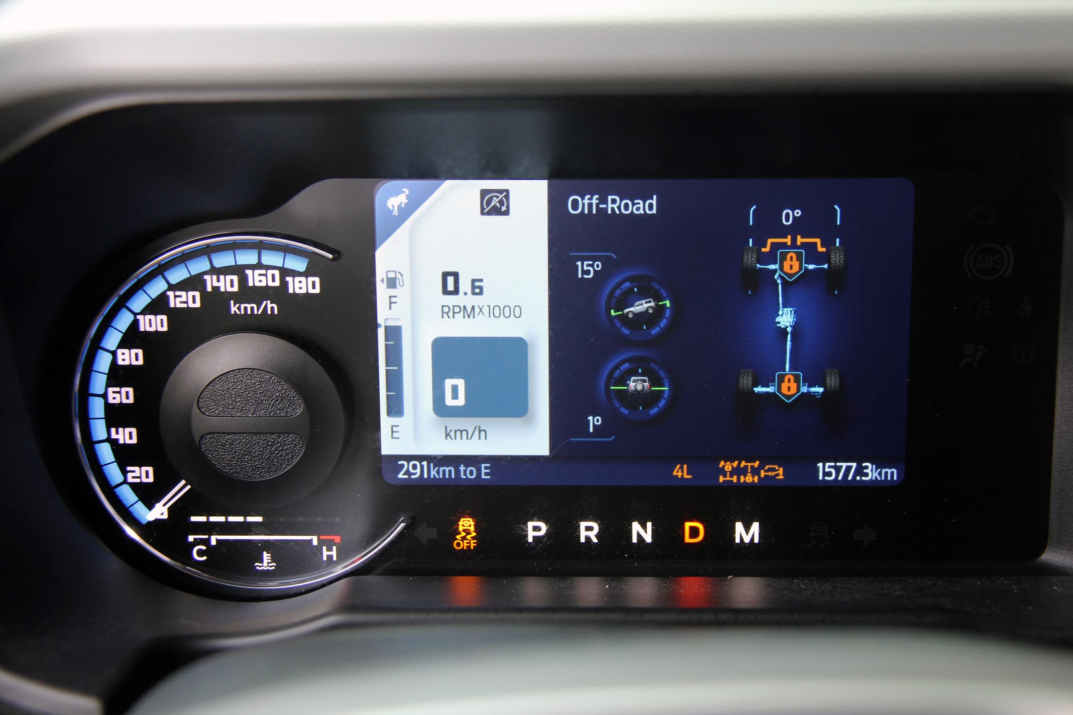 The big question is how the Bronco will compare to a Wrangler off-road. We didn’t do hardcore rock crawling, but embarking on a moderate, uneven grade comprising loose dirt and sand saw the wheels start to spin. No matter – I simply tapped the buttons atop the dash to lock up both diffs and I was off to the races.