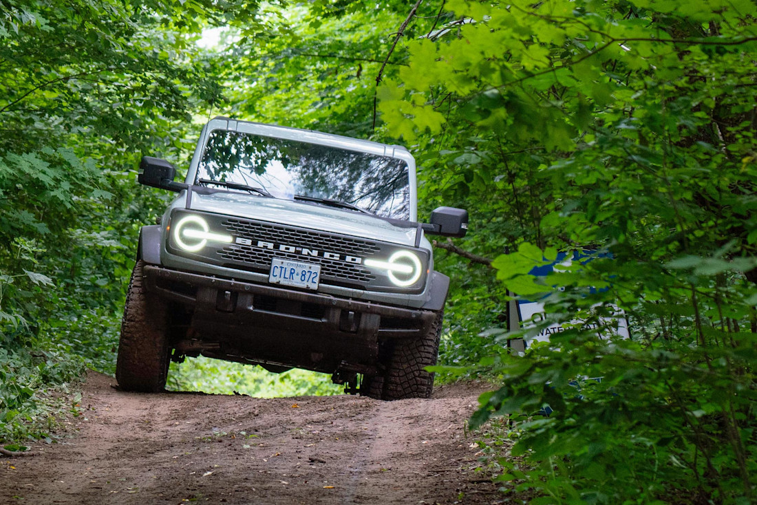 Then came the deep ruts and moguls. Push another button and the sway bar electronically disengages. It hunkers right down to give all four tires a better chance at traction over uneven terrain. Engaging the trail turn assist system applies braking pressure to the inside rear wheel at full steering lock, allowing the Bronco to essentially skid-steer around a tight corner or efficiently turn around in a small area.