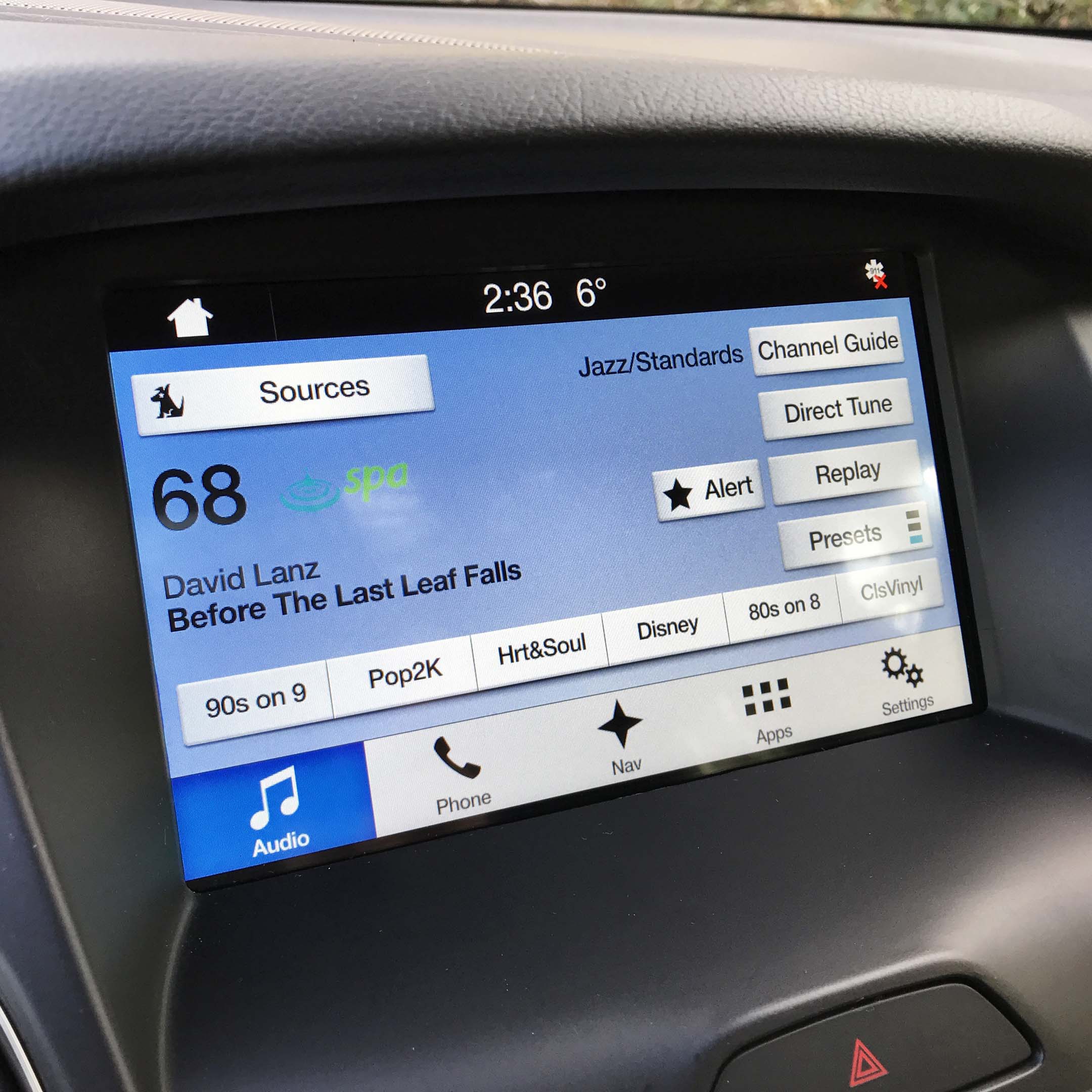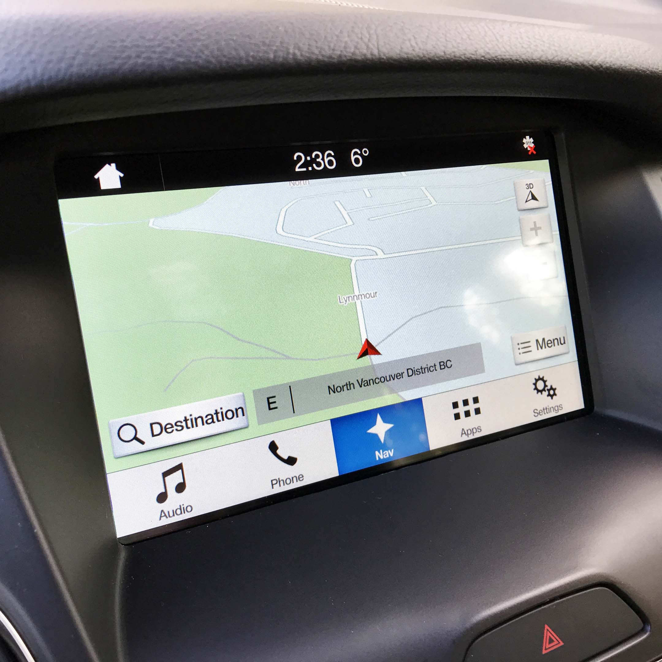 The large 8-inch touchscreen in the centre of the dash is home to Ford’s recently updated Sync 3 infotainment system. In general, I found that Sync 3 is easier to read and operate than Ford’s first Sync system. Sync 3 has better finger touch sensitivity, swipe and pinch capability, larger graphics and “tiles”, colours that are easier on the eyes, and quicker screen transitions. It’s also quicker to respond to voice commands for phone, audio or navigation commands. The Home screen includes a navigation map, audio info, and phone info while the bottom of the screen contains a menu bar for audio, phone, navigation, apps and settings.