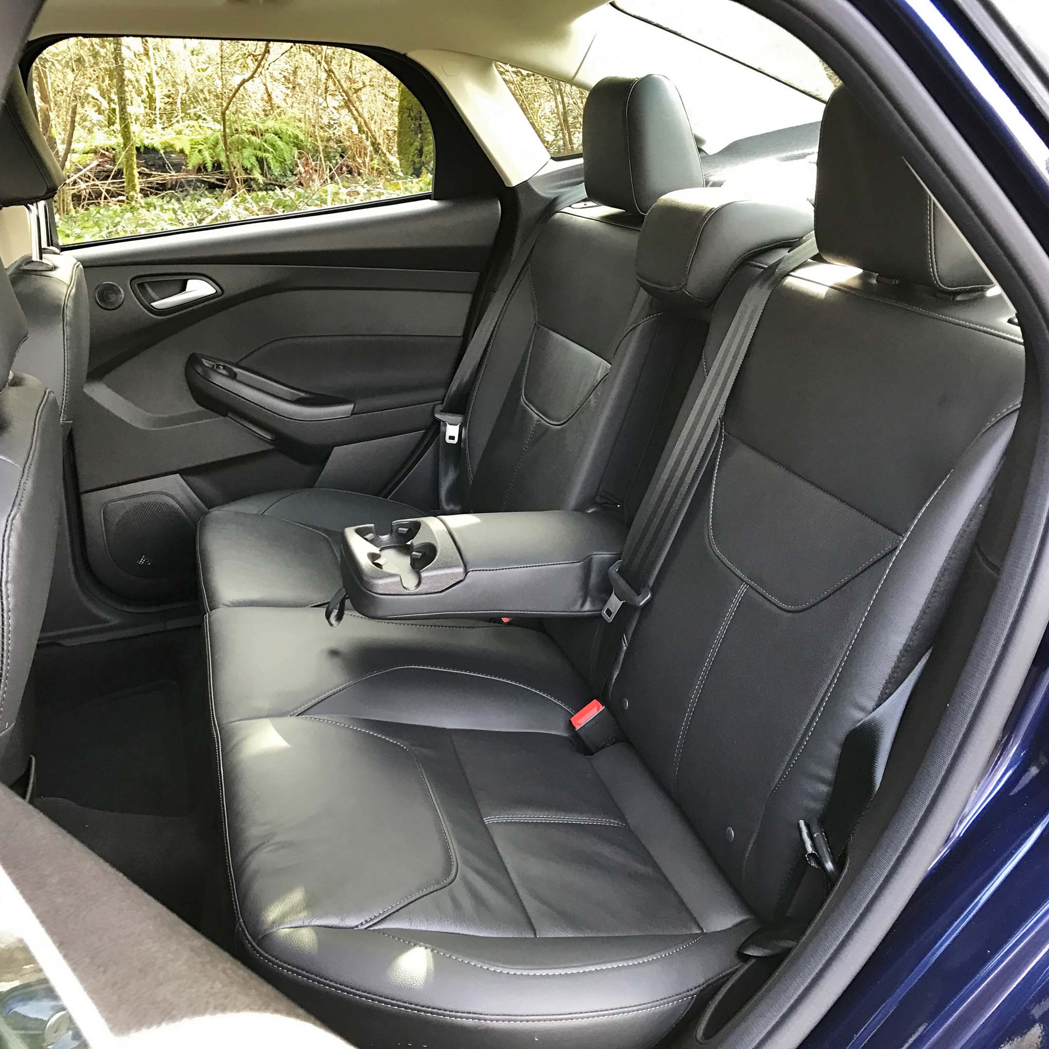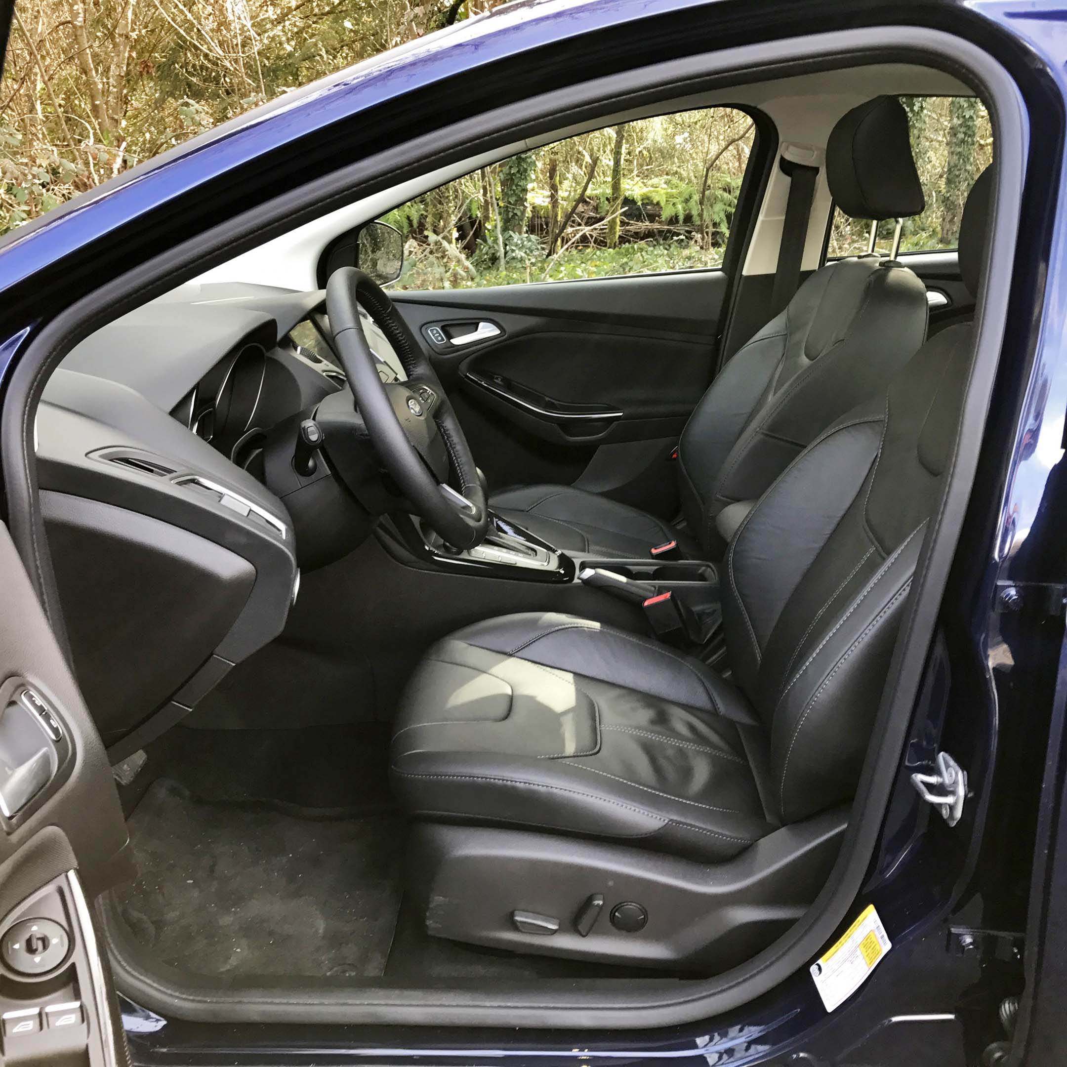 The Focus’ interior is mostly black in colour with some aluminum trim around the gear lever, air vents and controls and some glossy charcoal-coloured plastic trim on the dashboard, centre console and doors. Our top Titanium model came with heated leather seats and a heated, leather-wrapped tilt/telescopic steering wheel. The front seats are well padded and comfortable on longer drives but while the driver enjoys power rake, height and lumbar adjustments the front passenger has basic manual adjustments for rake and fore-aft – even in the top-of-the-line Titanium trim.