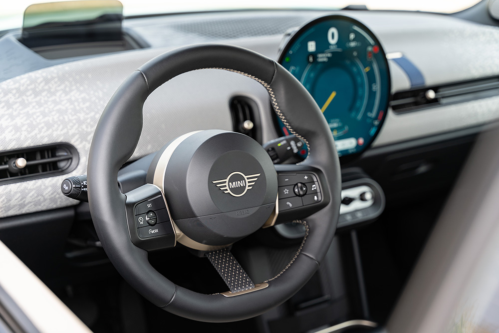 The material choices are exceptional. The dashtop and door panels are finished in a tweed-like fabric, and there’s a vertical accent strip above a central vent that serves no purpose except whimsical design. It’s also repeated in a similar fabric strip that forms the lower spoke of the steering wheel. The fun and creativity employed throughout the Mini’s cockpit is not only wholly appropriate for this car, but thoroughly appreciated.