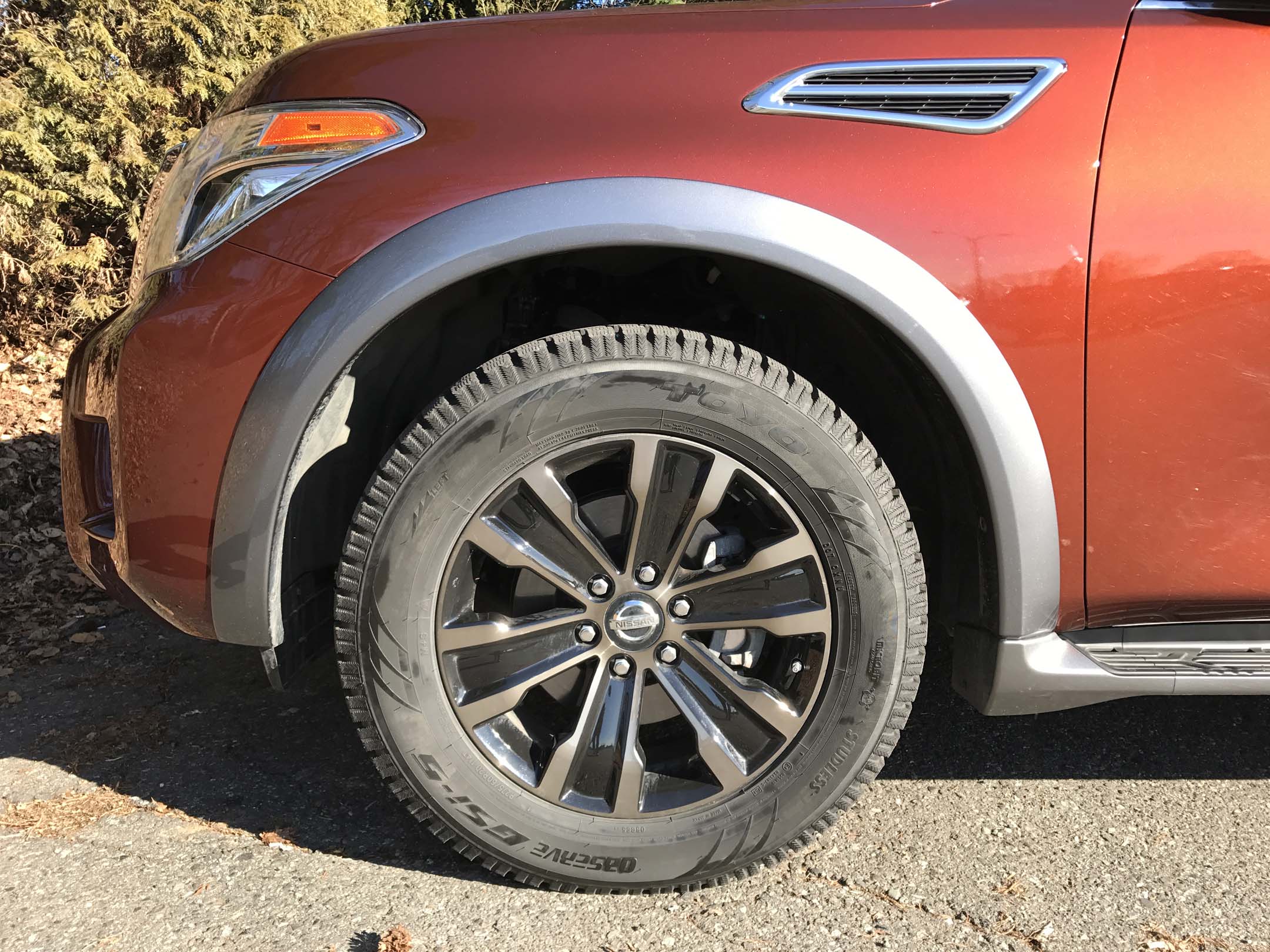 During our week with the Armada, a snowstorm gave us an opportunity to test its winter performance. Equipped with 20-inch snow tires, our Armada exhibited tenacious traction in soft snow and surface ice but we found some driveline binding when making a tight turn in 4 High. We also tried the driver-selectable Snow Mode in a parking lot covered in 20 cm of snow but couldn’t really tell the difference in traction between this and 4 High – both were good. We were particularly impressed with the traction of the Toyo Observe GSi-5 P275/60R20-inch winter tires on our test vehicle.