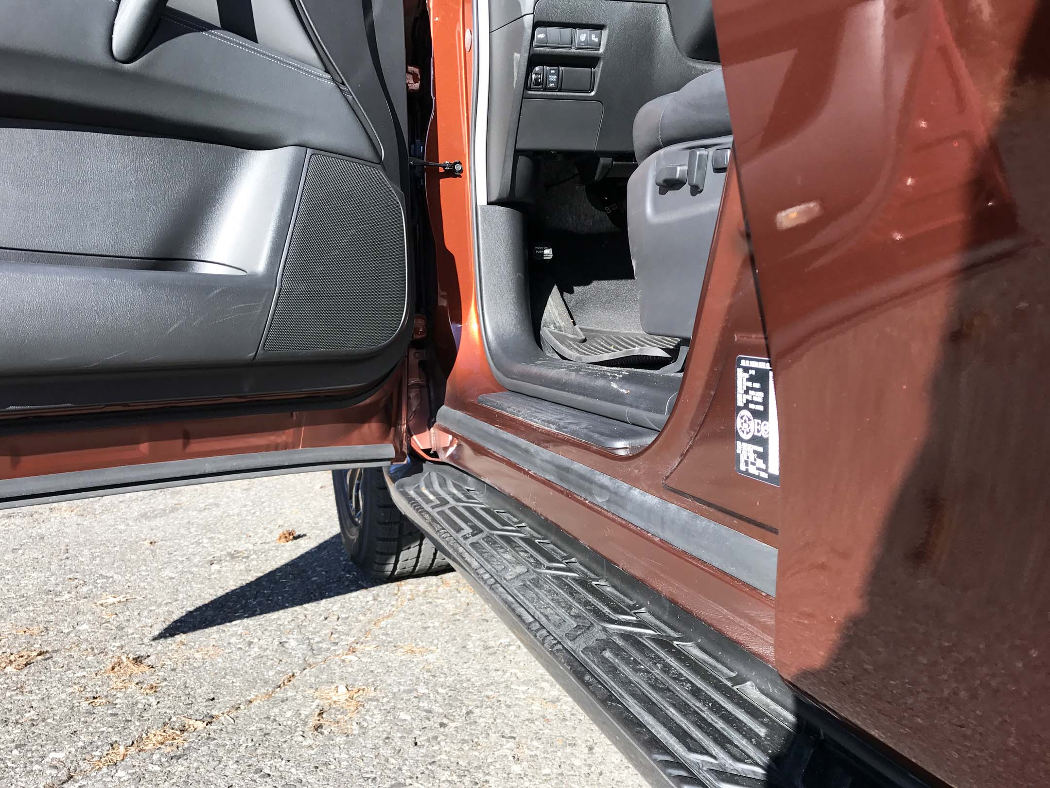 With its generous ground clearance and body-on-frame design, getting in to the Armada requires a big step up into the cabin. Standard running boards under the doors make it easier, but it’s still awkward: the running boards are a bit narrow for big boots. I developed a technique of planting my right foot on the running board, grabbing the grab-handle on the A-pillar, and swivelling around backwards to launch myself into the driver’s seat bum first. It’s not the most elegant entrance – probably not suited for the ladies – but it works.