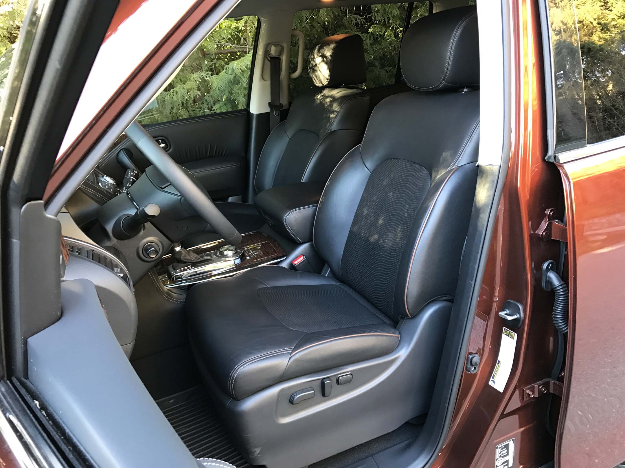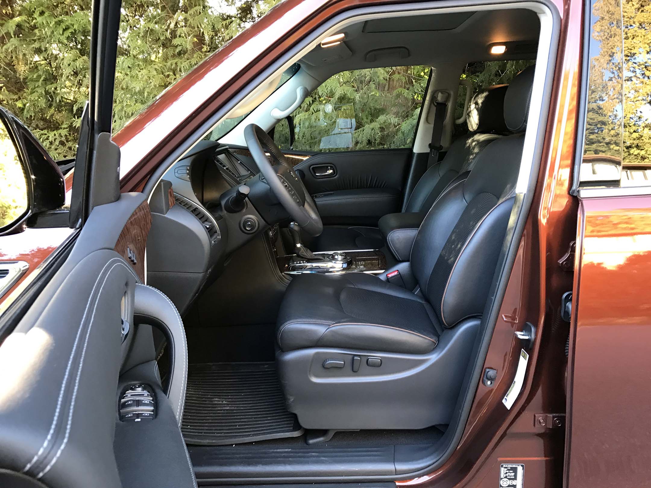During my week with the Armada in mixed city/highway driving, the trip computer display showed an average of 17.5 L/100 km while a second fuel economy display in the centre screen showed 18.1 L/100 km. Thank goodness the Armada uses Regular grade gasoline (as do, surprisingly, most of its competitors) and a big fuel tank: 98.4 litres. But be prepared to spend over a hundred dollars every time you fill up.