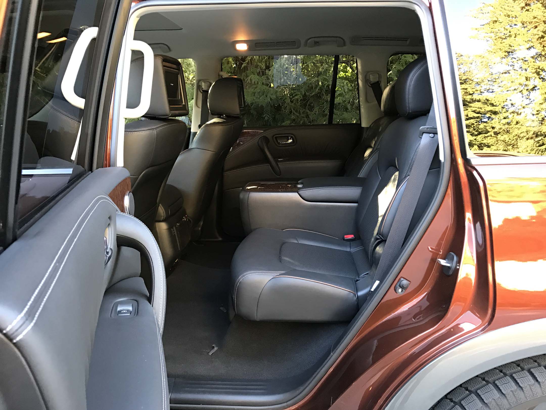 Our Armada Platinum was equipped with the two second-row captain’s chairs and centre console. We found the second row seats were not as comfortable as the first row and had very little lateral support. Headroom and legroom are generous and the seatbacks do recline but the seats don’t slide forwards and backwards. Between the seats, the elevated centre console has a padded armrest wide enough for both rear passengers, two cupholders, and two big storage compartments: one under the armrest and the second underneath the console accessed from the front. Second row passengers in the Platinum also get heated rear seats, rear climate control, and rear DVD entertainment system with twin video screens and headphones.