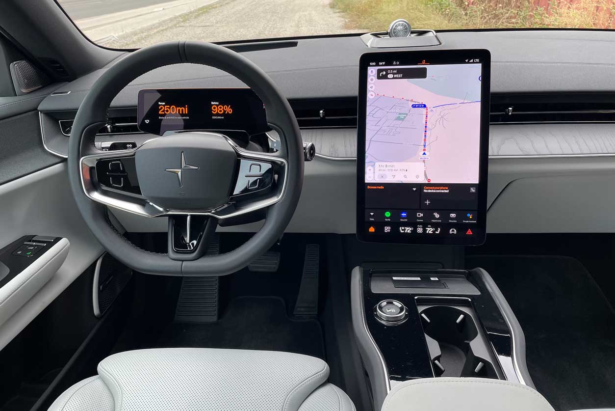 I know what you’re thinking. Nobody does that anyway in a heavy electric crossover, because these things don’t really play along. Ah, but the Polestar 3 is different. On the road, the 3 with its 50/50 weight distribution and low centre of gravity, it feels considerably less than its posted weight of roughly 2,600 kg (5,732 lb), depending on trim, and it flows along the twisties with poetic grace. A couple of times when I saw a particularly sinuous section of road coming up on the startling clear Google Maps navigation, I wanted to ramp up the go-fast parameters with the push of a button while keeping my eyes safely on the road.