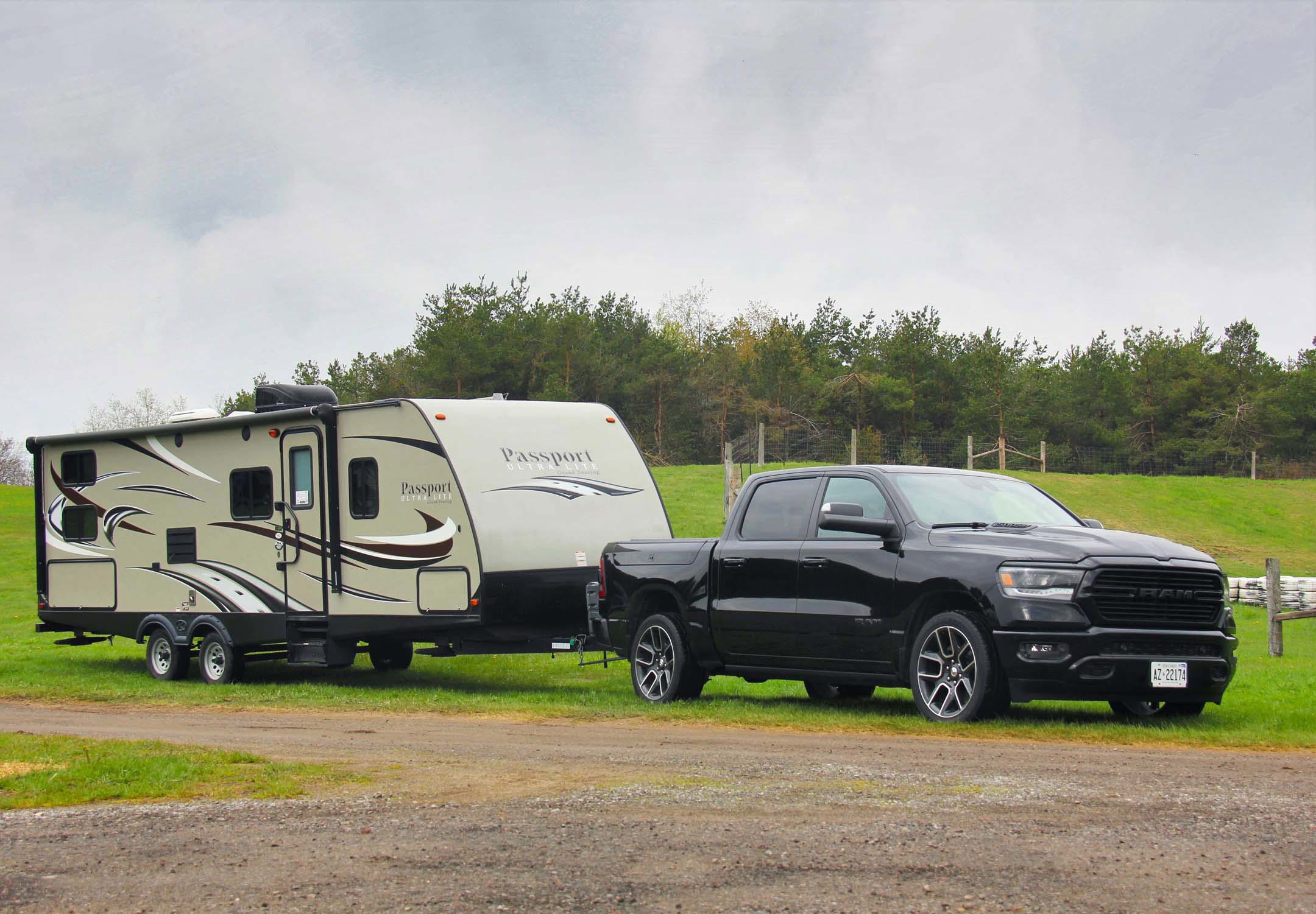The Ram feels much smaller than its dimensions and capability would suggest. Adjustable steering wheel, seats, mirrors and pedals allow for a comfortable driving position regardless of driver size and stature. While it isn’t targeted to an urban audience, it’s agile, and the adjustable suspension allows the truck to be lowered enough to easily fit in a parking garage. There are two 115V power outlets, USB ports everywhere and the massive 12-inch touchscreen makes it easy to operate climate controls, navigation or media. The Trailer Tow Group option is a must for anyone who plans on hitching up. Mounting the 2,495 kg (5,500 lb) Keystone Passport 2670 BH luxury travel trailer I’d arranged for the week from Sicard RV, I was prepared for a long ordeal to secure the proper connections and setup the trailer brakes. Arriving prepared with my adapter, the Ram had both popular power connections integrated into the bumper. Not only that, but the truck’s computer immediately recognized the size and weight of the trailer, automatically setting up the brakes. The whole thing took less than five minutes from start to finish.