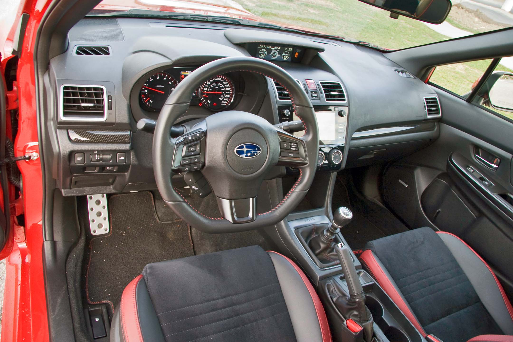 A leather-wrapped, flat-bottomed wheel looks great and feels fat and grippy. Steering is quick and delivers a decent amount of feedback. It may not have the locking centre diff of the STI, but the WRX’s brake-based active torque-vectoring system makes it a heck of a lot of fun to hit a curvy on-ramp. Selectively applying modulated braking to the inner front wheel, the system helps the car rotate around corners without plowing straight ahead into understeer.