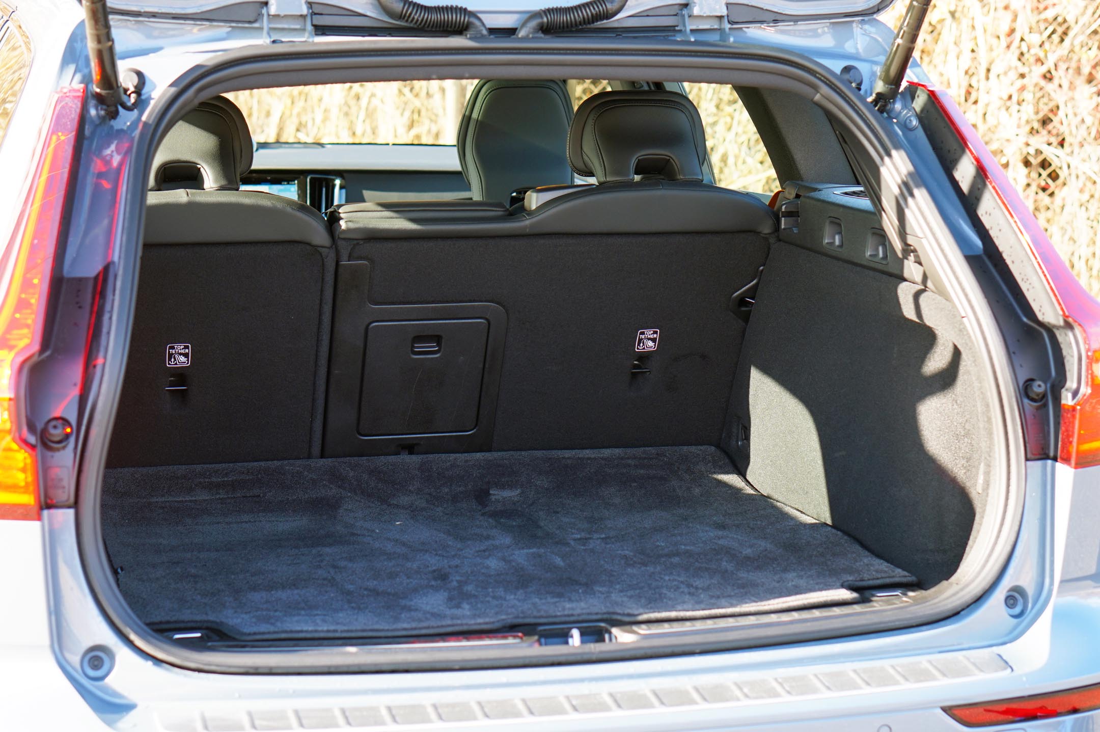 The V60 has a cargo capacity of 648 L, which expands to 1,431 L with the second-row seats folded flat. The handles to fold the rear seat flat are located in the trunk, and I love that the release also tumbles the headrests so they don’t get caught on the front seatbacks. The seats fold in a 60/40 split, but there’s a pass-through in the middle for skis or other long items.
